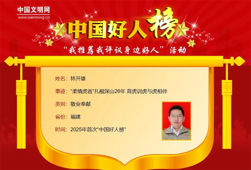 面对基地取得的成绩,林开雄谦虚地说:“同事们付出的比我多,你有机会多报道一下他们,组织上给我的荣誉已经很多了。”面对未来,林开雄话语坚定:“继续坚守,与华南虎为伴。”(供稿:福建省委文明办、海峡都市报 记者 吴日锦)