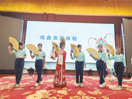 戏曲非遗小课堂把活动推向高潮。非遗知识抢答、戏曲表演体验……兴园中学的学生们在互动过程中掌握了戏曲的基本知识和技能,在学习和体验中感受戏曲之美。