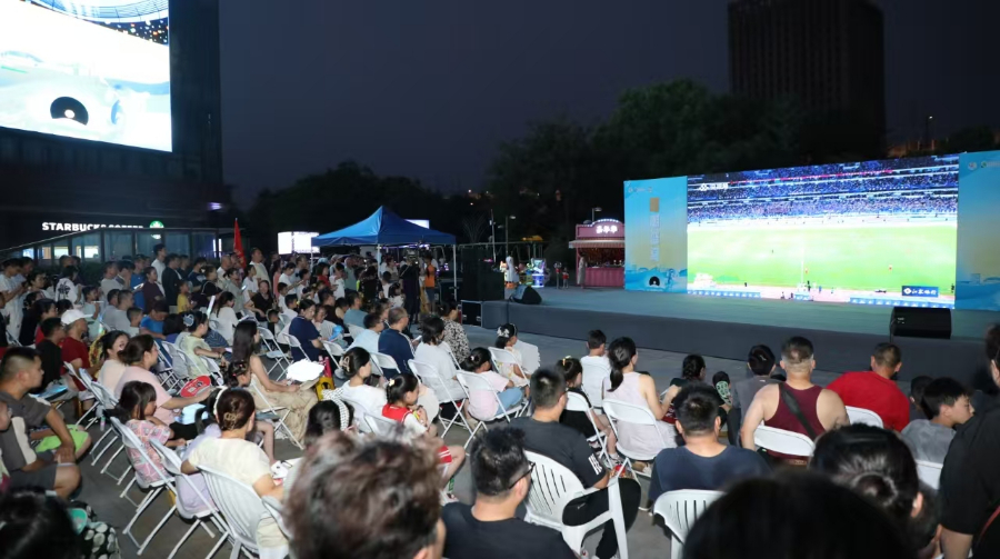 “点亮星夜 文明有吾”文明实践活动为居民带来文明新风和火热“苏超”。图片来源:江北新区葛塘街道
