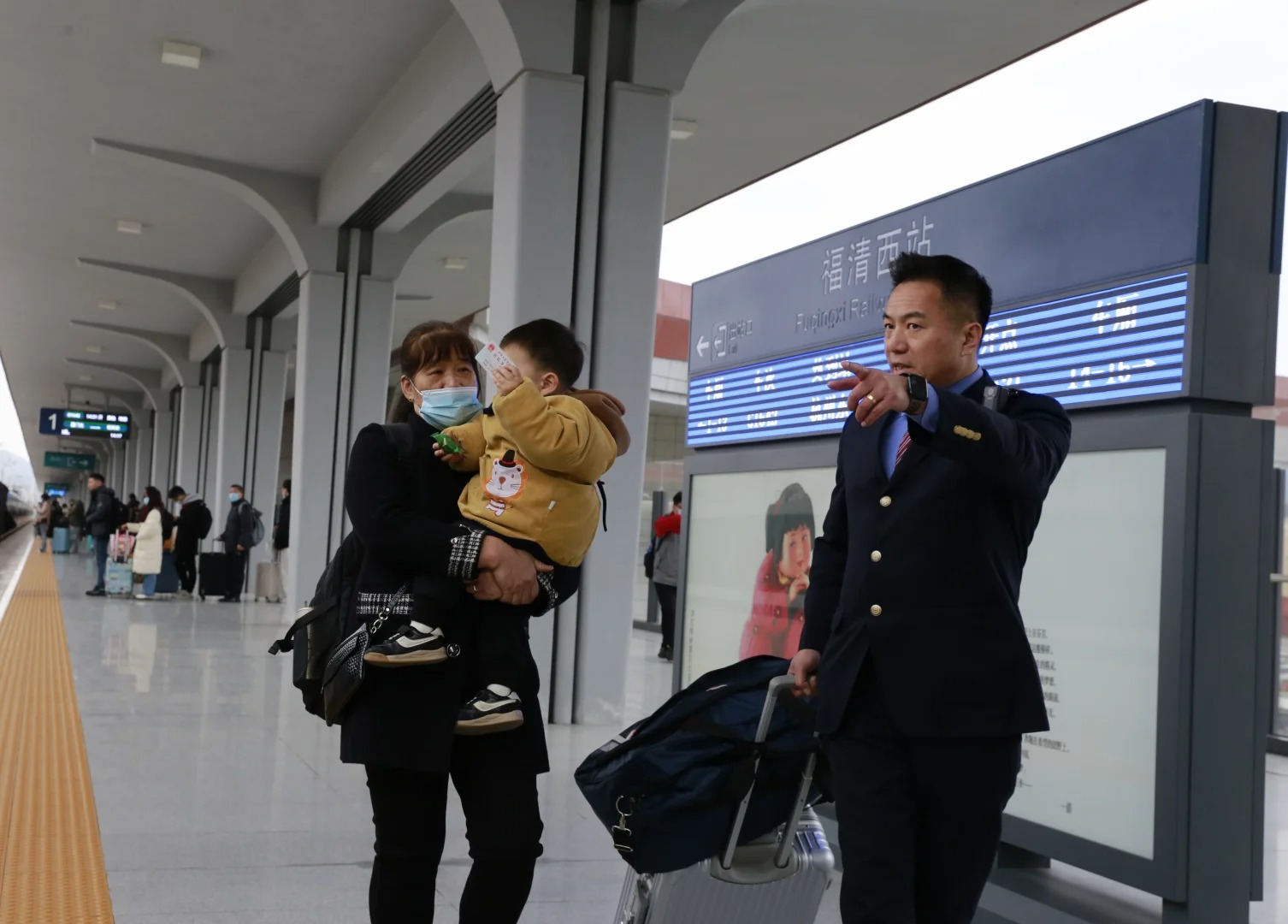 广州白云站内,志愿者们身着红马甲、高举指引牌,用实际行动保障旅客顺畅出行。