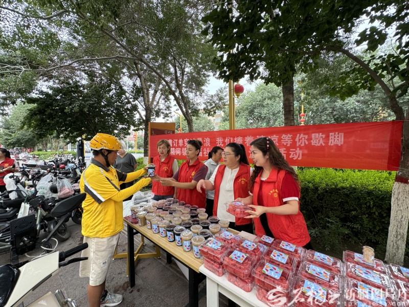 7月16日,幸福社区的志愿者为外卖配送员送上冰镇饮料和西瓜等消暑食品。那英摄