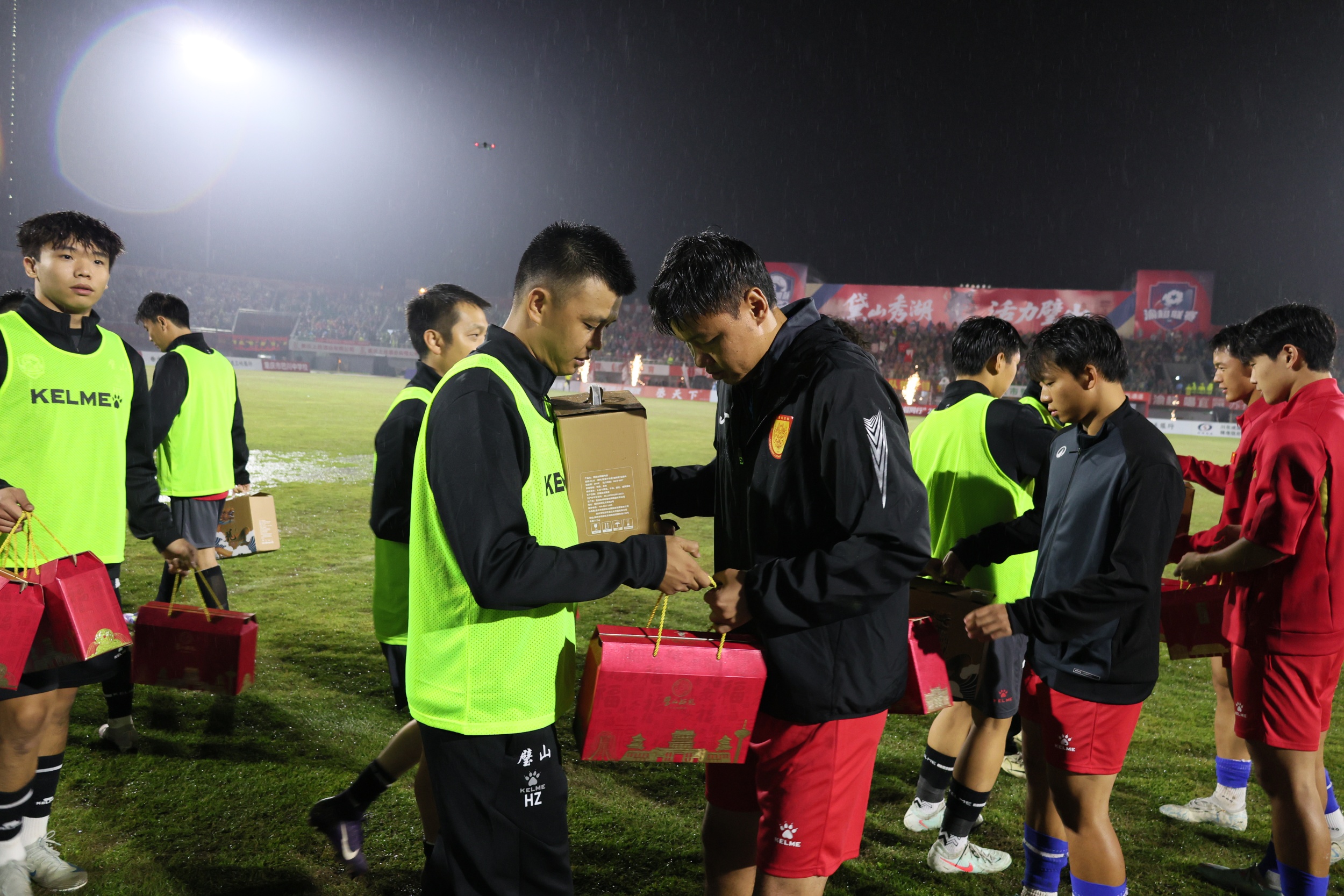 比赛开始前的交换环节成为两地文化交流的温情缩影。璧山球员手中的特产透着“乡土气息”,每一样都承载着本地的生态与风味;而铜梁火龙队带来的非遗文创同样亮眼。当两队球员双手交接特产时,场边观众自发响起掌声,既是“以球会友”的体育精神体现,更是璧山区统筹推动文明培育、文明实践、文明创建的微观落地。
